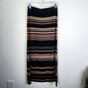 - Description: Black fair isle striped knit maxi length skirt; elastic waistband
