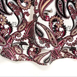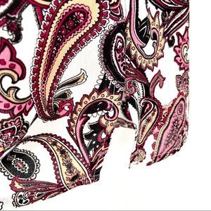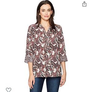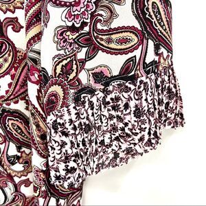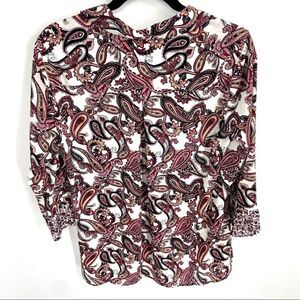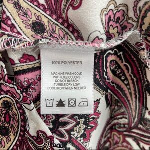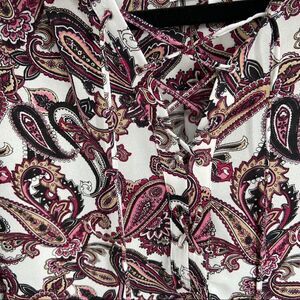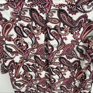 Size 10. Great used condition minimal sign of wash and wear. Smoke free home. White, black, burgundy, pink paisley print. Lace up front and contrast printed pleated cuff details. 3/4 length sleeves. 100% Polyester. Machine wash tumble dry.