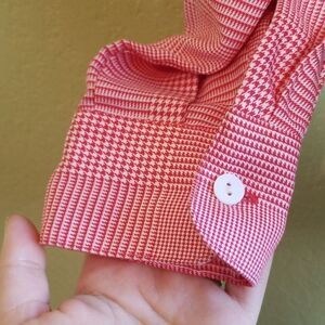 This is a red and white houndstooth button down top by Foxcroft. It features the brand stitched inside (photo 7), and extra buttons sewn on (photo 5). Please note there is a spot of discoloration seen in photo 3.
