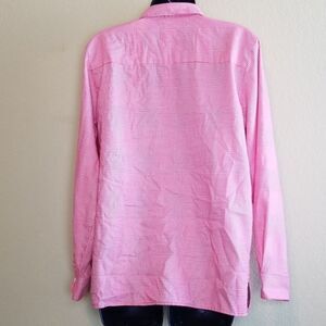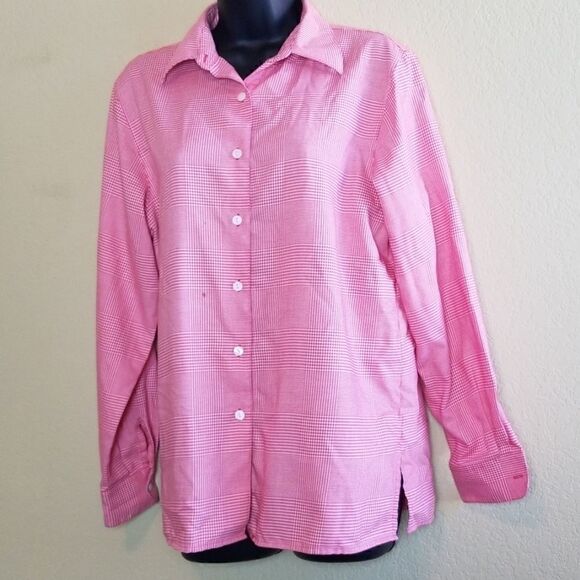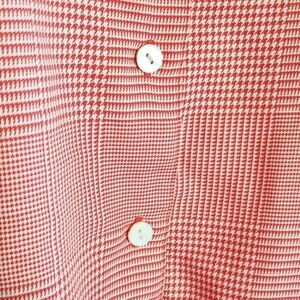This is a red and white houndstooth button down top by Foxcroft. It features the brand stitched inside (photo 7), and extra buttons sewn on (photo 5). Please note there is a spot of discoloration seen in photo 3.