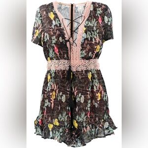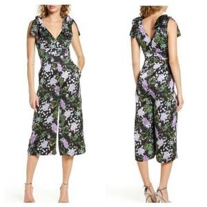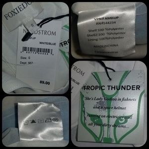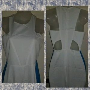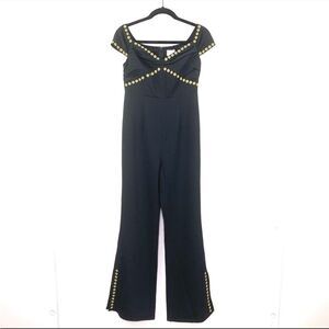 A paneled bodice w/ cutaway shoulders & sporty back cutouts cinched at waistline b4 releasing in2 playfully flared pants. result is vtg-insp jumpsuit, complete w/ brightly colored contrast stripes trimming sides.