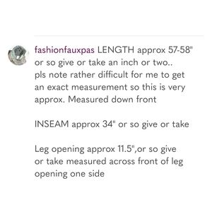 60" length, 34" inseam, 24" leg opening (sz Med)