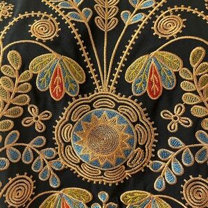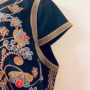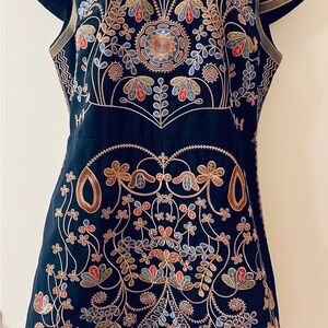 Anthropology Foxidox Elegant Navy Blue dress with intricate colorful gold embroidery. Very artsy, eclectic, Boho chic Hippie dopamine dressing, definitely a statement piece, wedding guest dress cocktail dress country club, brunch Perfect for any special occasion. This dress is a size large. Armpit to armpit 18 inches waist 30 inches length 33 inches.