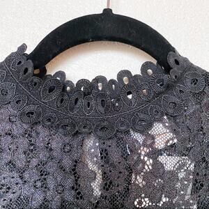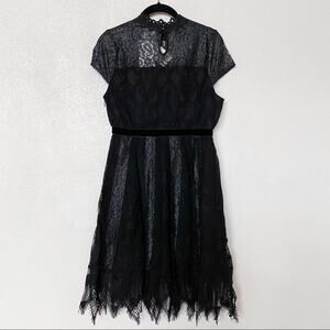 Black lace dress from foxiedox. Lace mock neck, short sleeves and velvet strip at the waist. Sheer at the sleeves and chest. Lined bust and skirt. Lace detail hangs slightly lower than the lining, and adds a beautiful detail! Single button closure at the back of the neck.