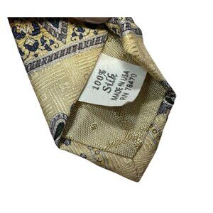 A luxurious men's necktie with intricate geometric and paisley patterns in gold and blue tones. Made from 100% silk, it adds a refined touch to formalwear.