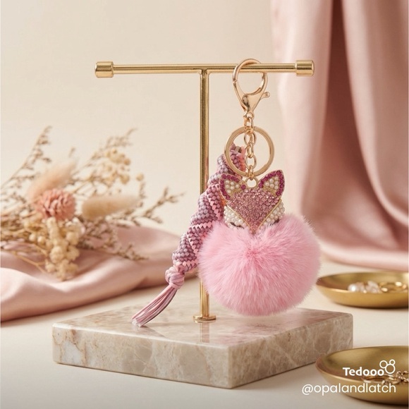 This handmade blush pink luxe keychain features a fluffy pom pom, a braided wristlet detail, and a stunning rhinestone fox charm with delicate pearl accents for that extra sparkle ✨ The gold hardware ties everything together for a chic, elevated look that’s both stylish and functional.