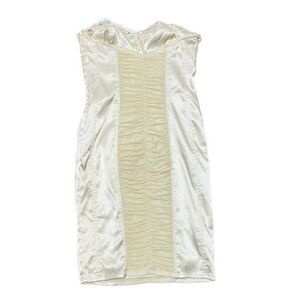 This dress is an absolute showstopper! Beautiful cream satin with flattering curve enhancing stretch. Built in bra, ruched sheer gauze middle section and hidden side zip closure. Wear it alone or with a fur coat, it's stunning. EUC, worn only once.