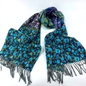 This Fraas scarf showcases a sophisticated blend of blue and gray hues, perfect for adding a touch of elegance to any ensemble. The abstract pattern and delicate fringe details at the ends create a stylish and artistic accessory. Ideal for both casual and formal occasions, this scarf is a versatile addition to your wardrobe.