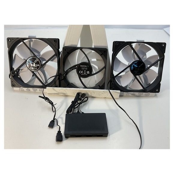 This is a set of three 140mm computer case fans from Fractal Design and DeepCool, ideal for enhancing your PC cooling system. The fans are in good used condition, showing minimal signs of wear and are fully functional. Included in this set is a DeepCool SC790 model controller, ensuring efficient and customizable cooling. These fans are perfect for PC builders and gamers seeking reliable cooling solutions. Fans and controller are as shown in the images, no additional accessories or packaging included.