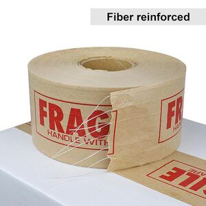 Secure and safeguard fragile shipments with this heavy‑duty, fiberglass‑reinforced kraft paper tape. Measuring 3″ x 450 ft (150 yds), the tape features water-activated (gummed) adhesive for superior bonding to cardboard cartons. The “Fragile – Handle with Care” pre‑print alerts handlers immediately. Ideal for glassware, ceramics, collectibles, or other delicate items that need extra protection. Smooth unwinding—no curling or splitting—ensures quick and neat sealing by hand or with a dispenser. Tear-resistant, tamper-evident, and designed for heavy loads, it delivers reliability and peace of mind to shippers.