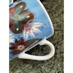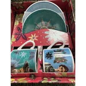 The Fragonard Porcelain Espresso Set - Visages Du Monde - Frida & Mariachi is a Mexican-themed cup and saucer set featuring unique designs inspired by Frida Kahlo and mariachi music. The multicolor painted porcelain set is perfect for hot beverages and all occasions, adding a touch of Mexican style to your collection. With its original design and decoration, this set is a collectible piece that showcases the fusion of Mexican culture and modern aesthetics in a visually appealing way. one if the cups have a small bubble. see photos