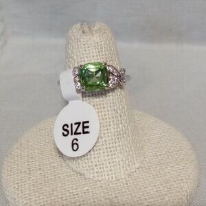 Silver band with square lab peridot green stone in the middle and silver butterfly on each side with clear sapphires.