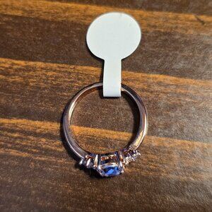 A beautiful pink crystal sits centered on this ring with clear CZs on the side, plated in 18k rose gold!