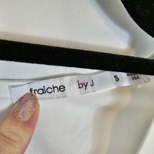 NWT Fraiche by J Mini-dress with 3/4 length sleeves in white. Size Small. Hidden back zipper closure. Deep V-neck. Partially lined. Equivalent to size 2-4, see the Measurements. Gathered at the shoulders and across the bustline.