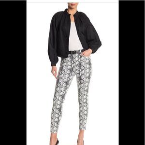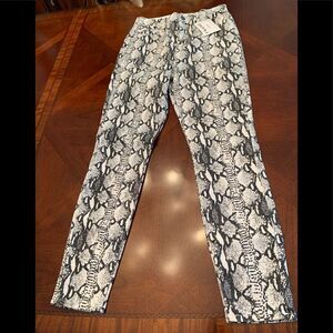 Size 26, A high waisted python printed skinny jean is perfect for trendy styling. Sizing: 24=00, 25=0, 26=2, 27=4, 28=6, 29=8, 30=10, 31=10-12, 32=12 - Zip fly with button closure - High waisted - Snake print - Skinny leg - Denim construction - Ankle crop - Approx. 11" rise, 26" inseam (size 26) - Made in USA This item cannot be shipped to Canada.