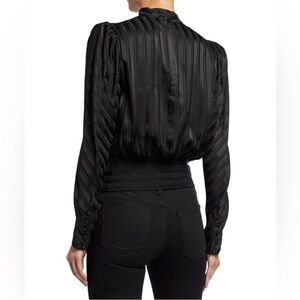 Pre owned excellent condition worn once or twice. Stunning black, 100% silk satin finish pinstripe keyhole jacquard blouse with puff sleeves. So beautiful and sophisticated. Can be dressed up or down. WOMENS size small.