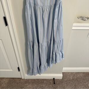 I adore this super flattering and adorable designer FRAME blue striped cotton/hemp square neck strappy tiered asymmetric hem maxi dress