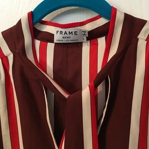 Burgundy/red/cream stripes stand out on this silk charmeuse shirt. Hi/lo style. In very good condition. No tears or marks. Recently dry cleaned.