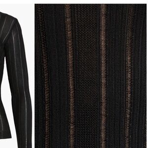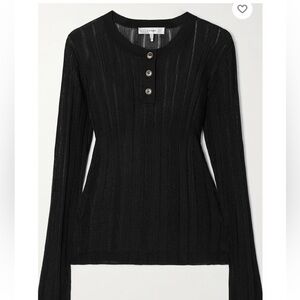 Sleek black ribbed top with button details. Long sleeves for versatile styling. Ideal for casual or dressy looks.