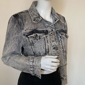 Frame Denim Black & Grey Acid Wash Cropped Jean Jacket w Raw Frayed Hem