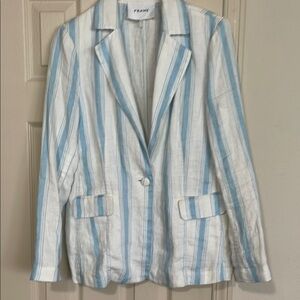 Discover the perfect blend of style and comfort with the Frame linen Blue and White Striped Blazer. This blazer, crafted from lightweight fabric, offers a fresh nautical-inspired look ideal for spring and summer. Its classic cut ensures a versatile addition to any wardrobe, suitable for both casual and semi-formal occasions. Extra covered button
