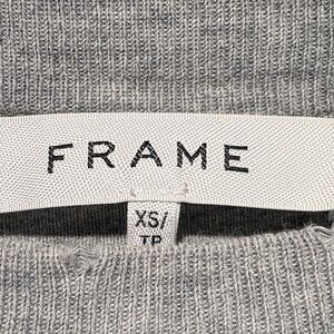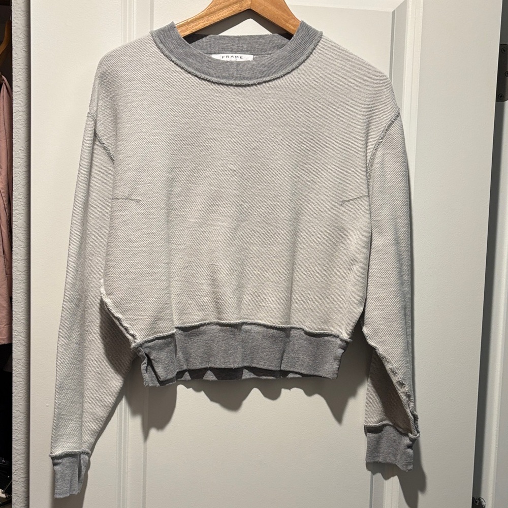 Cropped ribbed pullover from Frame Denim. Light gray knit with darker gray trim. Simple, versatile layering piece. Clean, minimal design. Distressed cuffs and collar.