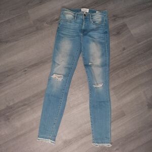 Frame Denim skinny jeans. Faded/distressed style. Size 25. Raw distressed hem line. 94% cotton, 4% polyester, 2% elastane. Great pre-owned condition.