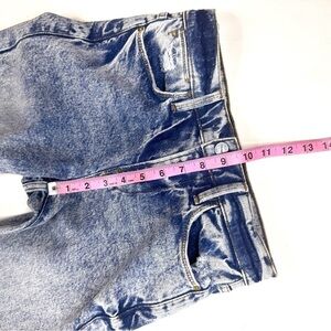 Frame Le High jeans. Straight-leg silhouette, high rise. Lombard color is a blue acid wash. Lightly distressed, especially on front pockets and fly. Denim is lyocell, cotton, elastane blend and has some stretch. Excellent used condition: no stains, holes, or pills.