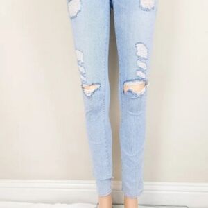 Trendy light blue skinny jeans. Features distressed details. Perfect for casual wear.