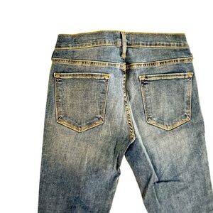 Frame denim mid tone Le skinny de Jeanne whiskered frayed hem. The “Culver”. Made of cotton, polyester, and elastane. Made in USA. Euc