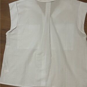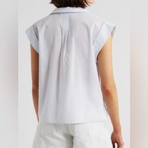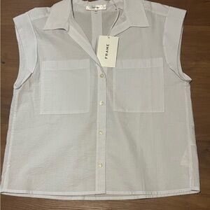 Elegant light chambray blouse. Features button-up front. Stylish cap sleeves.