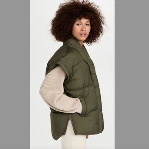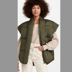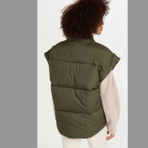 Stylish olive puffer vest. Sleeveless design. Perfect for layering.