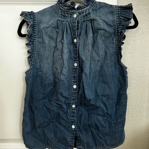 Chic ruffled denim top by Frame Denim. Features button-down front and elegant detailing. Perfect for casual wear.