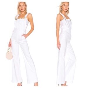 Bright white color. A scalloped bib adds supersweet detail to '70s-inspired wide-leg overalls woven with a hint of stretch for comfort. Adjustable shoulder straps with buckle closure. Chest patch pocket; front slant pockets; back patch pockets. Wide leg, low back cut and fit.