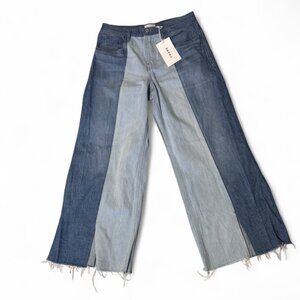Stylish wide leg jeans by Frame Denim. Features a light and medium blue color block design with a split seam and a raw hem. Perfect for a unique look.