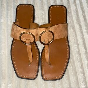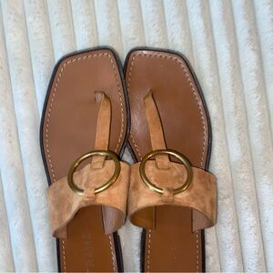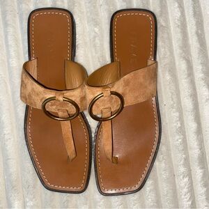Step into effortless style with Frame Denim's tan sandals, crafted for those who appreciate minimalist elegance. These sandals feature a wide single strap and a smooth leather finish, making them perfect for casual summer days. Enjoy the comfort of a flat sole that complements any warm-weather outfit.
