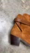 Stylish tan suede ankle boots with a sleek design. Features a sturdy block heel and leather strap detail. European size 38 frame chart says that is a us 7.5