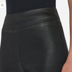 High rise. Sleek skinny leg. Cropped silhouette. Slits at hem. Soft, subtle luminous coated denim fabrication with stretch. Body hugging fitted style. Pull on style.