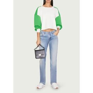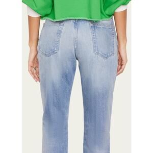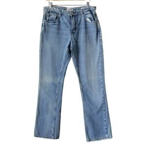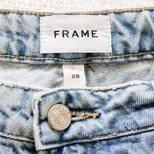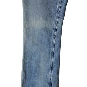 Please see all photos. There is distressing around the hips and seams. There is a white cotton discoloration line going through the jeans.