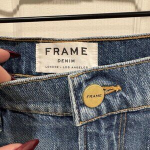 This Frame Denim Mini Frayed Hem Jean Skirt in a size 28 features a casual yet classic style in a light blue wash. Made from cotton denim with a zipper and button closure, this American-made skirt is perfect for any season. The mini length and unlined design add to its laid-back appeal, while the pockets offer functionality and style. Ideal for a festival or everyday wear, this skirt by Frame exudes a timeless charm with a touch of modern flair.