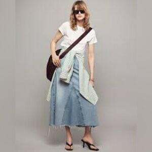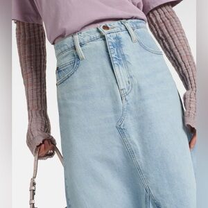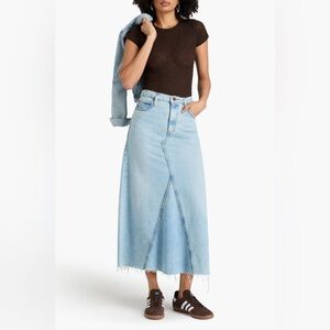 Giving the illusion of a jean that's been reconstructed into a skirt—this high-rise maxi features an angled seam at the front and back with a frayed hem for a true vintage look. It's crafted from a FRAME sustainable denim made with recycled materials.