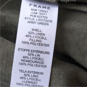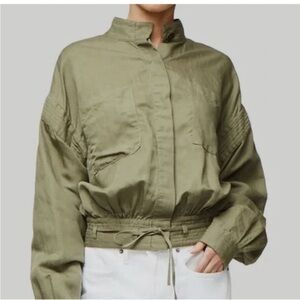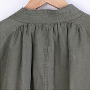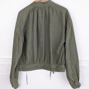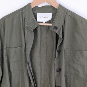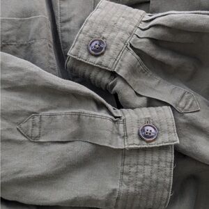 Lightweight, linen blend, army green jacket with hidden button placket with tie waist. Great gently pre-owned condition.