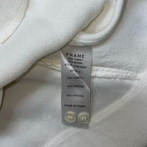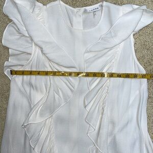 Frame Knotted Flutter Sleeve Button down the Back Top Size Small. This blouse has a sweet and feminine feel with a flouncy ruffle flutter falling from shoulder to waist, finished with a tie front hem. Buttons down the back add a more classic look. Crepe like fabric. 2 extra buttons included. Approximate measurements in pictures. Excellent condition.