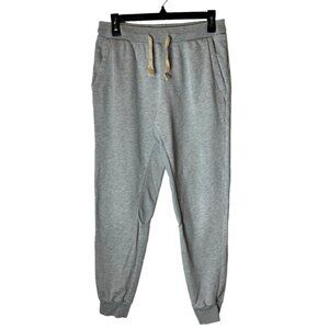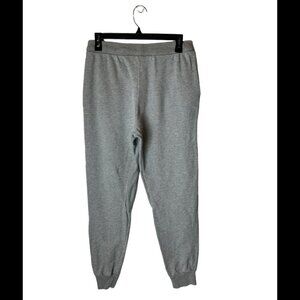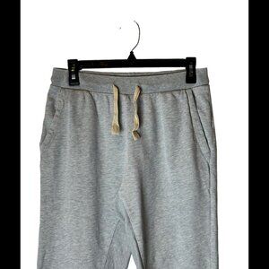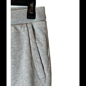 These jogger pants from Frame are in good condition. They are in a solid gray color. They feature; a wide waistband with an adjustable drawstring tie, distressed features, side slash pockets, cuffed hem, pull on styling, high waisted cut and are crafted from 100% organic pima cotton.