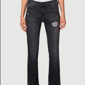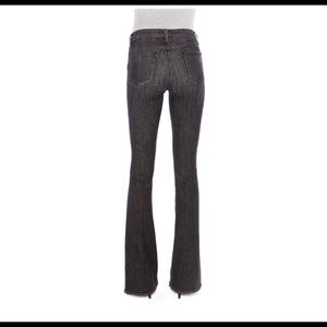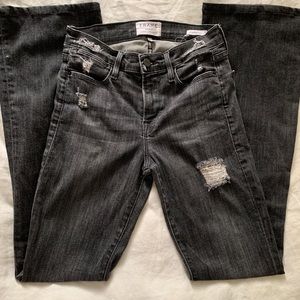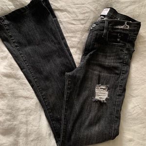 Gray/black wash with distressing throughout. 70s silhouette, this high rise jean is form-fitting through the hips and thighs with an easy flare from the knees. In great condition, worn only a few times. High rise about 10”