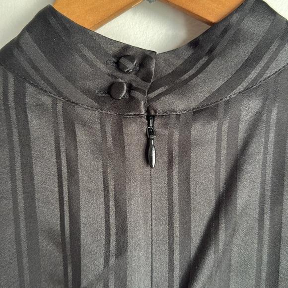 Lustrous tonal stripe silk top with front keyhole and a banded blouson silhouette.