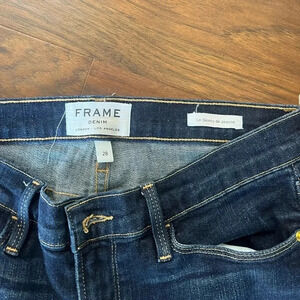 what I have here is a very gently used pair of Frame skinny jeans. these are a women’s size 28 and the length or the inseam seems to be 27 inches. Please refer to pictures. This is a darker color. If you know, you know. This is a pair of higher and designer jeans. Retails for over $200 brand new. All of my items come from a smoke-free homeand are well cared for. Considerate offers are welcome.