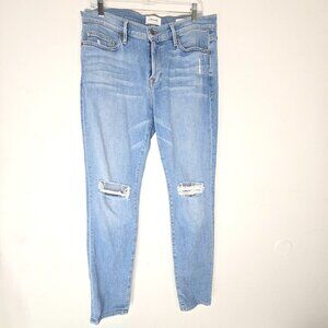 Frame signature skinny fit jean crafted from premium denim in a distressed, light blue wash. With classic 5-pocket construction and a standard mid rise waist, this pair features rips at the knees and a fitted leg from thigh to cuff.