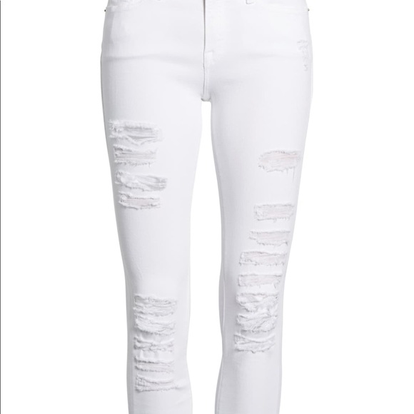 Purposeful rips with washed, frayed edges give a London-inspired grunge edge to super-skinny jeans cut from premium, L.A.-designed stretch denim.