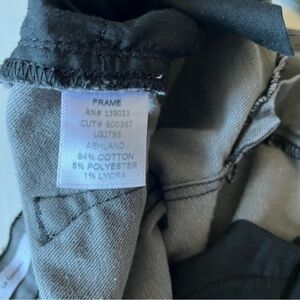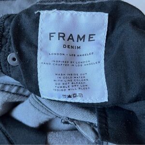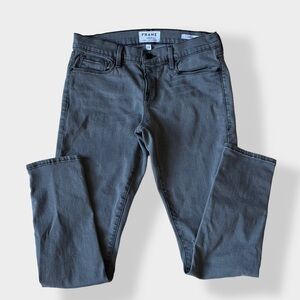 Frame Le Garçon low-rise jeans in gray with a distressed knee. Classic 5-pocket style with a zipper and button fly. Skinny leg. Great condition.